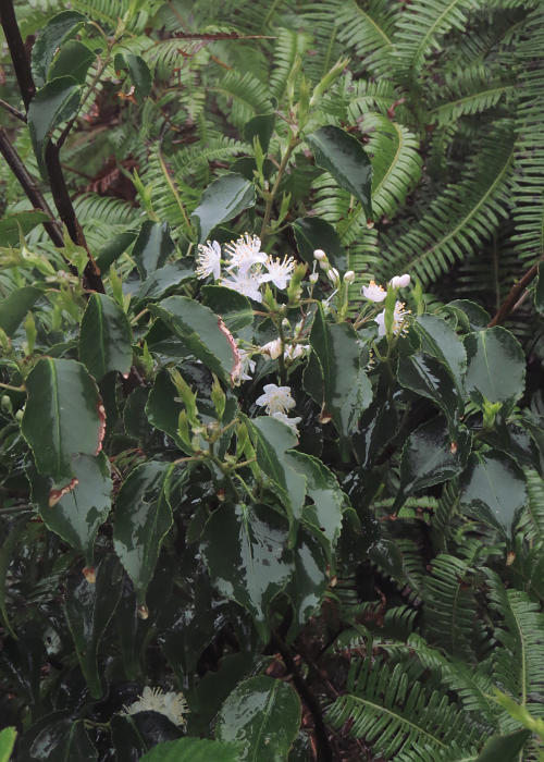 事前の調べで、この島にはハイノキの葉が狭卵形〜広披針形であるのに対し、和名のように葉の幅が広くやや楕円形である本種があることを知っていたので、傘を差しながら撮影した。