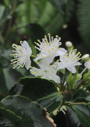 花は前年枝の葉腋に散房状につく。花冠は白色で5深裂し、径約12mm。雄しべは多数あり、花冠と同長。