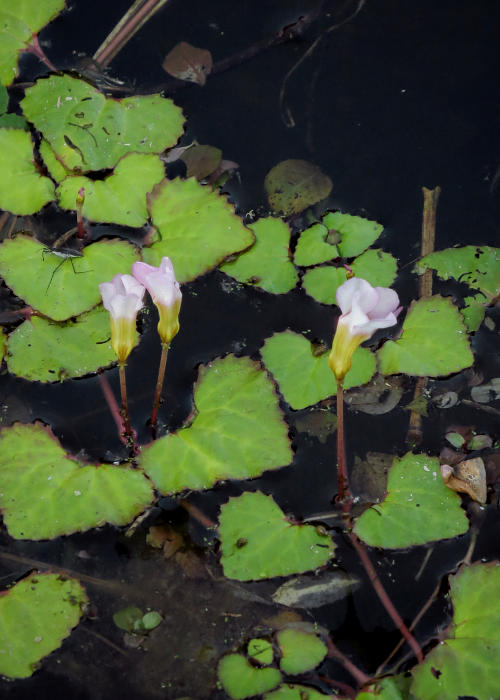 何度かこの花の撮影にチャレンジしていたが、葉は見るものの閉鎖花ばかりで水上に咲く淡紅色の花は憧れの的だった。