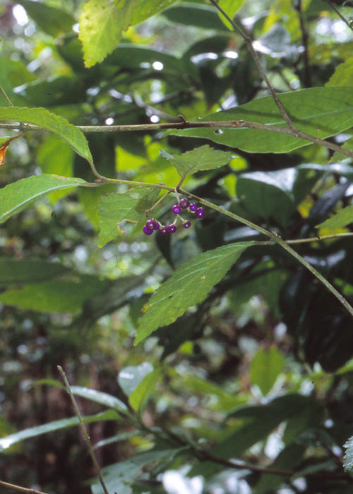 秋の終わり、花は無理でも果実の写真ぐらいはと山中を歩くと、紫色の実をつけたムラサキシキブを見つけた。