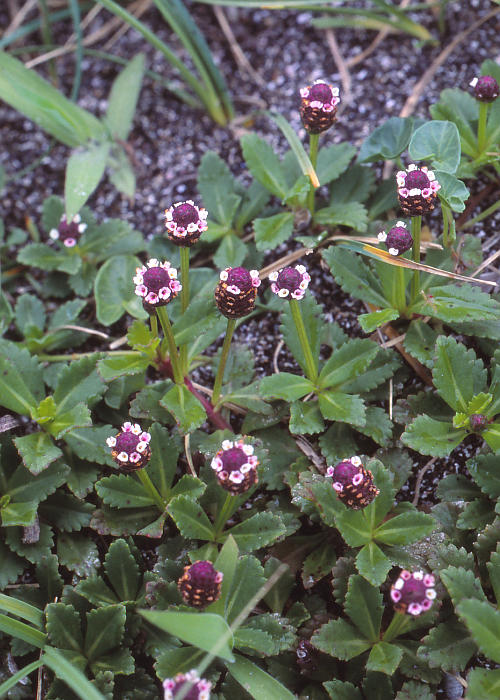 花は葉腋から花茎を伸ばし先端に円柱状の穂状花序をつけ、花は扇状の苞の間につき、花冠は紅紫色でやや唇形、直径約2mm。