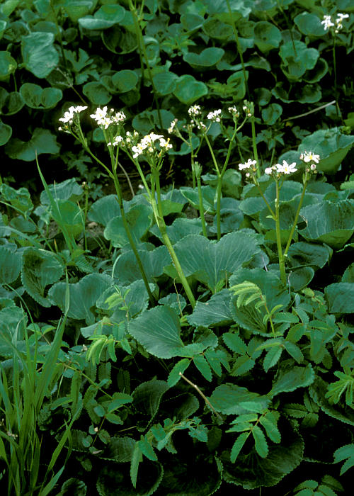 高山帯の湿地に群生していることが多く、丸い葉の間から長い花茎を伸ばし、その先に縁にしわのある星型の白い花を咲かせる。