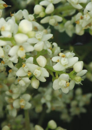 花は枝先に長さ15〜25cmの直立する円錐花序となり、径3mm程度の小さな淡黄白色の花を多数つける。花弁は5個のうち3個が大きく広卵形、2個は小さく線形。雄しべは5個、普通2個が完全、残り3個は仮雄しべで大きな花弁の基部につき、鱗片状で白く子房を包む。萼裂片は5個、広卵形。花序には毛が密生する。