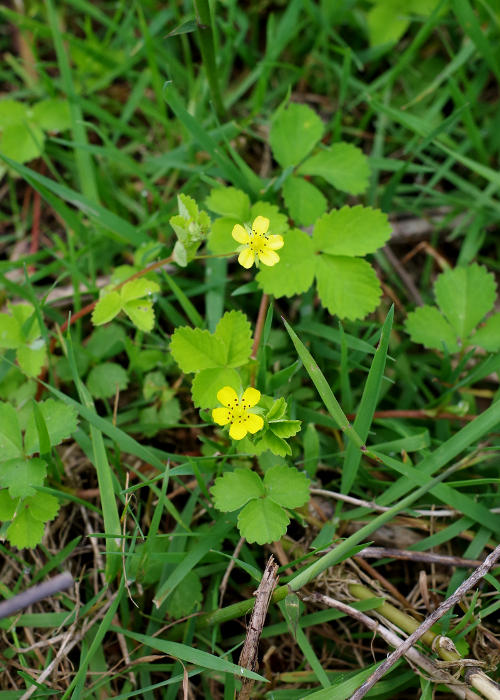 葉は互生し、3出複葉、小葉は倒卵形〜楕円形、長さ0.5〜1.5cm、幅0.4〜1.5cm。先は鈍頭〜円頭、縁は歯牙状の鋸歯縁。質は薄く、明るい緑色、表面は無毛、裏面はわずかに粉白色を帯び、脈上に圧着した毛がある。