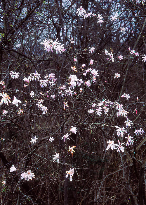 若葉が芽を出したばかりの春浅い丘陵地、少し湿地っぽい林の中に淡紅色を帯びたコブシにた花をつけた木が点在していた。