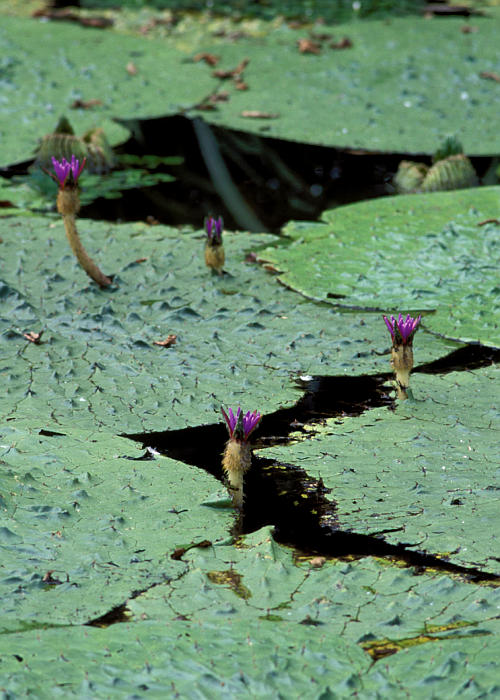 花は長い花柄の先に1個つき、径約4cm。花弁は多数あり、広披針形〜倒披針形で鈍頭、紫色、長さ6〜10cm。雄しべは多数あり、花糸の長さは不揃いで葯は長さ3〜3.5mm。子房下位で普通8室あり、柱頭は盤状でへこむ。萼片は4個、長楕円状披針形で鈍頭、長さ約20mm、緑色で外面に刺があり、基部で合着して萼筒となり、内面は紫色。花は昼開き、夜閉じる。水中には多数の閉鎖花をつける。