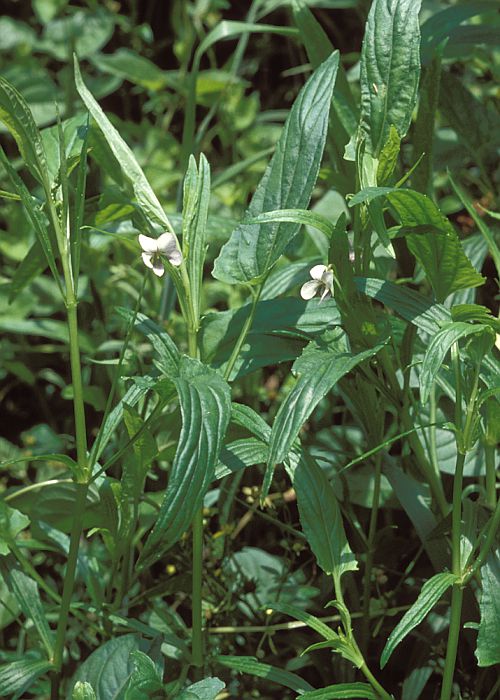 河川沿いのアシ原や湿った草地に生え、細長い葉で、花後1m近くに伸びる茎は、とてもスミレとは思えない。