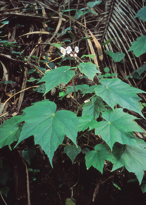 葉は互生、葉身は斜卵形で掌状に裂け、長さ10〜15cm、幅7〜12cm。先は鋭尖頭、基部は非相称の心形、縁は浅く欠刻し、重鋸歯がある。質は膜質、表面にわずかに毛がある。葉柄は長さ約10cm。