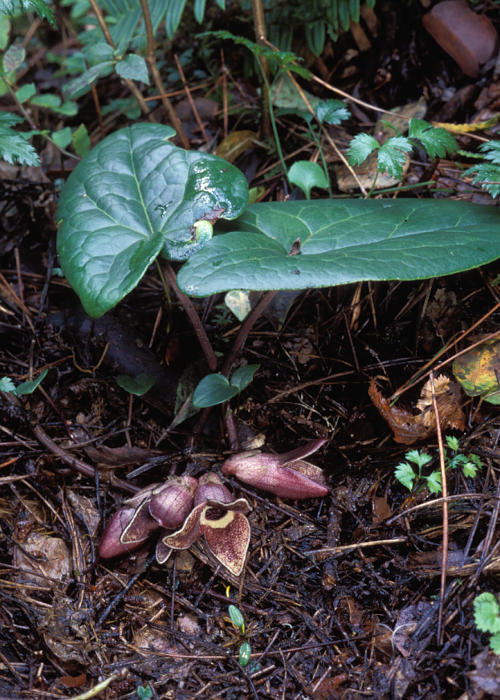 花は花弁化した萼が下半部で合着して萼筒になり、萼筒は暗紫色、ヒメカンアオイ系でサンインカンアオイに良く似ているが、詳しいことは不明。