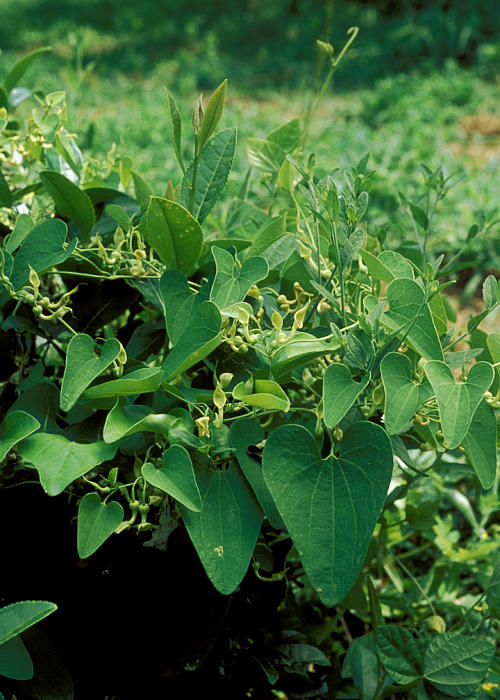 茎は長さ2〜3mになる、無毛でつる性の多年草。