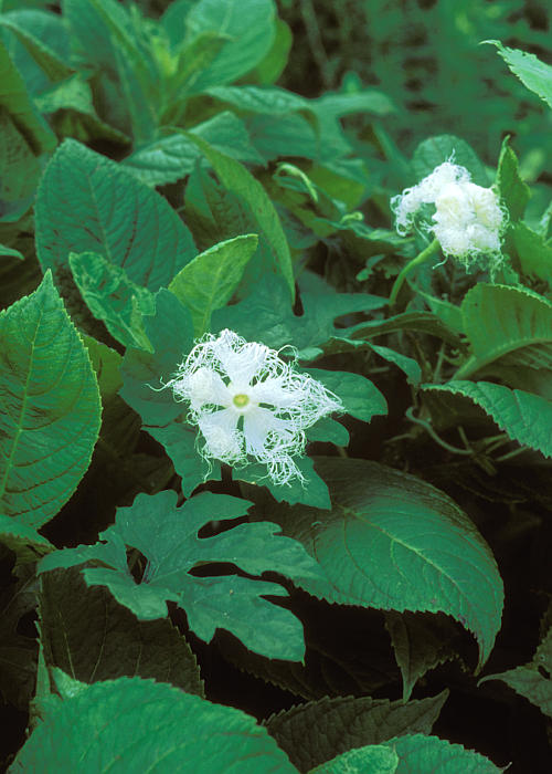 葉は5裂するモミジカラスウリによく似ているが、同じ日に出会ったモミジカラスウリと比べると、本種ほうが葉の光沢があると感じたが、詳細を書いた文献が見当たらず違いははっきりしない。