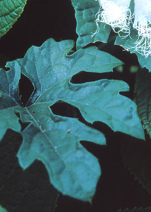 葉は互生、葉身は円心形、5〜7中〜深裂し、表面は濃緑色で光沢がある。
