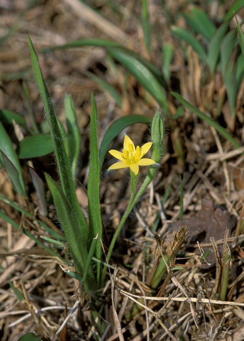 花は葉の根元の葉腋から5〜10cmの花茎の先に1〜2個つく。苞は線形で膜質、長さ5〜8mm。花被片は6個、下部は筒状にならず、黄色、披針状長楕円形で半開し、長さ4〜6mm。花全体に毛があるが、特に外花被片の先端背面に多い。雄しべは6個、花被片の基部につき、葯は線形〜卵形で基部が凹み、長さ1.5〜2.5mmと花糸より短い。子房の上部は嘴状の突起にならず、花柱は長さ2〜3mm、柱頭は3個、直立して柱状、長さ1〜2mm。