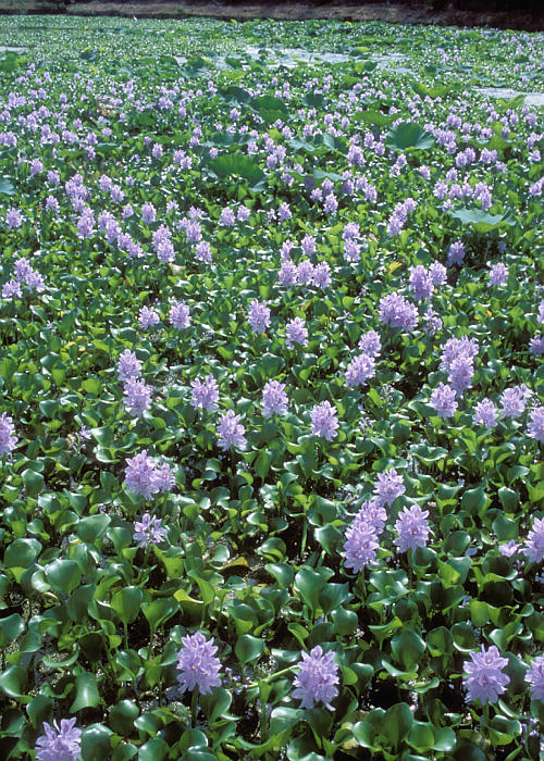 明治中期に観賞用として持ち込まれたものが逸出し、暖かい地方の水田や沼などでは上の写真のように水面を埋め尽くす大群落になることもある。