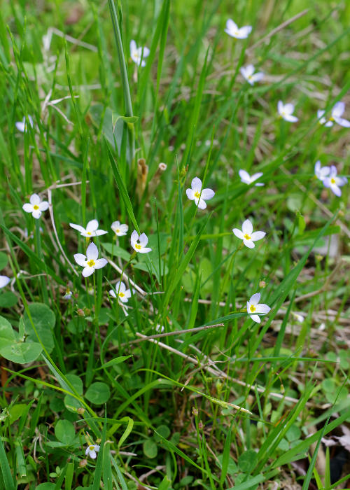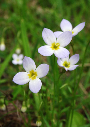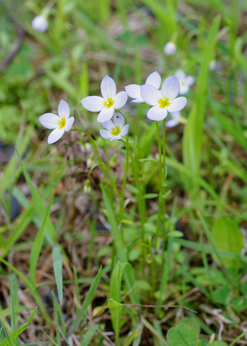 花は茎頂に単生する。花柄は直立し、長さ2〜7cm。花冠は高杯形、径10〜14mm、先は4裂し、裂片は幅約2mm、白色〜淡青色で中心部は黄色味を帯びる。雄しべは4個、雌しべは1個、柱頭は2個。長雄しべで短雌しべのものと、その逆のものがある。萼片は4個、長三角形〜長楕円形で鋭尖頭、長さ1〜2mm。花筒は長さ5〜6mm。