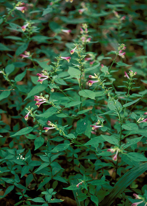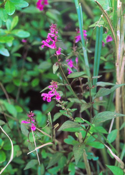 花は上唇が赤紫色で下の唇弁の先が白、斑紋が黄色という花が一般的であるが、九州の南部には赤紫色一色というタイプもある。