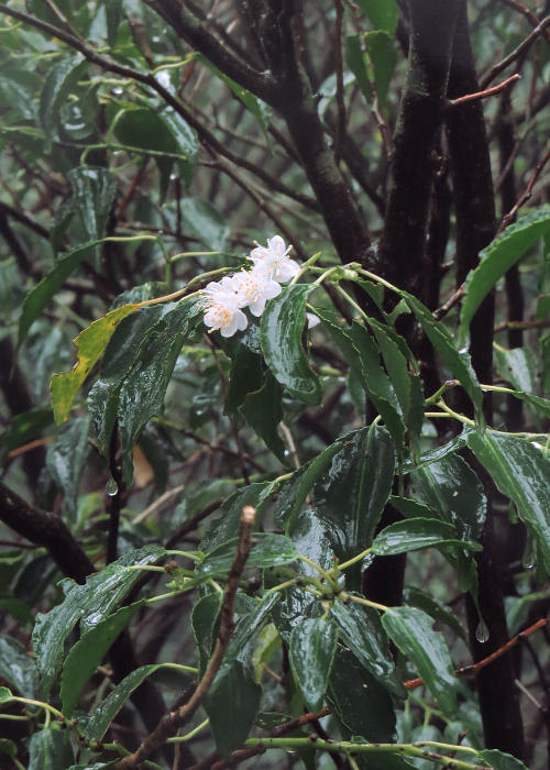 事前の調べで、この島にはハイノキの葉が狭卵形〜広披針形であるのに対し、和名のように葉の幅が広くやや楕円形である本種があることを知っていたので、傘を差しながら撮影した。