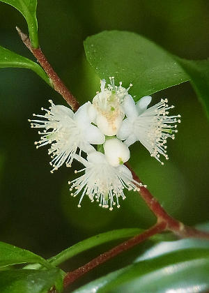 花は葉腋から出た長さ約1cmの花序にややまばらに3〜7個つき、稀に基部で分枝することがある。花柄は長さ1〜4mm、花序軸、萼や苞には淡褐色の短い圧毛がある。苞と小苞は小さく、長さ0.5〜1.5mm、卵形で残存する。花冠は白色で5深裂し、長さ4〜6mm。雄しべは50〜100個、花盤は有毛。