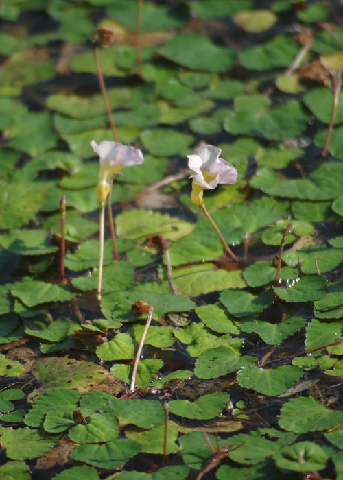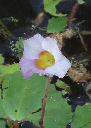 花は茎の上部の葉腋から2cm程度の花柄を水上に出し、1花を横向きにつける。花冠は淡紅色、唇形で下部は黄色の筒部となり、長さ2〜3.5cm。上唇の先は2裂、下唇の先は3裂し、裂片は円い。閉鎖花をつけることが多い。