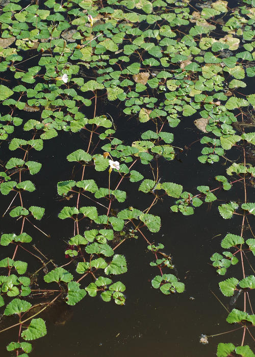 葉は対生し、水上葉と水中葉があり、水上葉は三角状円形〜腎円形、長さ2〜3.5cm、幅2.5〜4cm。先は円く、縁には先の鈍い鋸歯があり、基部は開いた浅心形。葉柄は長さ1〜3cm。水中葉は細く、披針形。