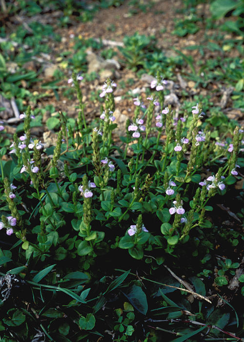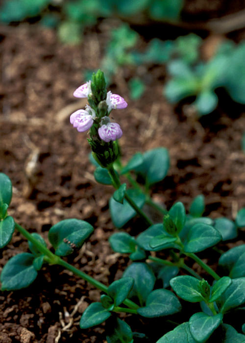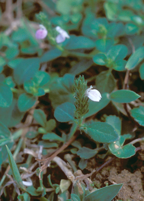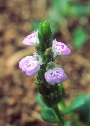 花は茎の先に穂状花序に密につける。苞は広倒披針形。花冠はやや小型で、淡紅紫色でキツネノマゴよりやや濃色。