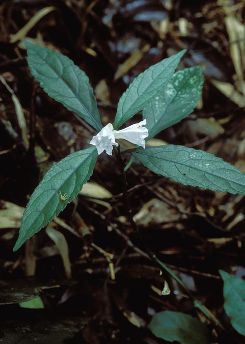 葉は対生、葉身は広披針形〜長楕円形、長さ5〜13cm、幅1.3〜3.5cm。先は長く伸び、基部はしだいに狭まって葉柄につながり、縁には浅い鋸歯がある。表面は無毛で、裏面にはやや密に毛があり、不規則に走る線状の鍾乳体がある。葉柄は長さ3〜15mm。