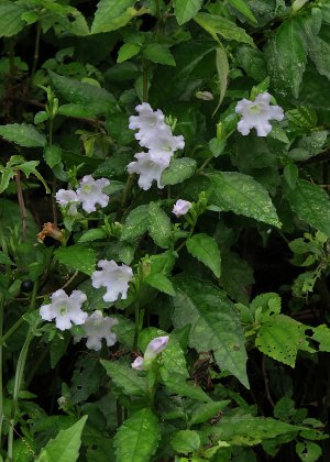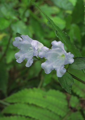 花は茎頂か上部の葉腋に短い穂状花序となり、単性する花をつける。苞は葉と同形でより小さいか、倒披針形〜線形で先は鈍い。花冠は広い漏斗形で網目模様は不明、淡青紫色か白色、長さ約3cm。先は5裂して円く(先端のものはしばしば6裂)、長さ5〜6mm。花粉は球形で、しばしば乳頭状の突起がある。萼は不等に5裂し、先は線形で尖り、長さ11〜20mm、下側2片は深く裂け、上側3片は2/3程度まで裂け、無毛で苞とともに縦に走る鍾乳体がある。
