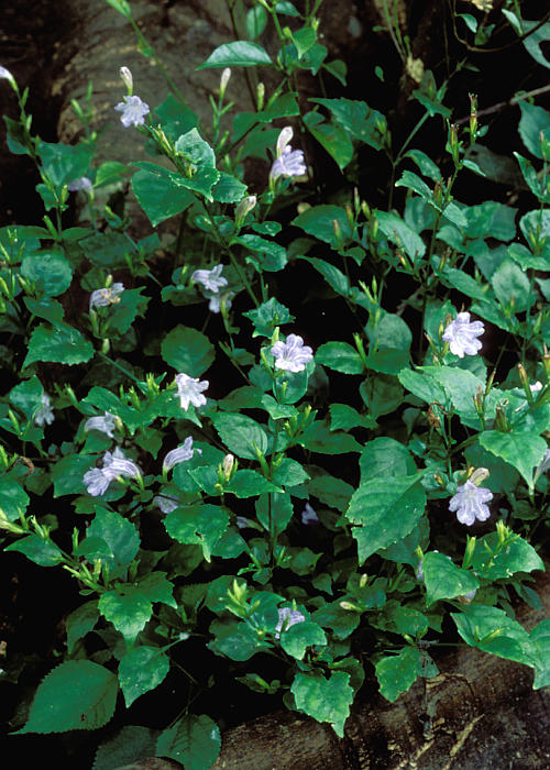 花は枝先につく多数の花序枝の各節につく。花の直下の葉(苞)は、普通小苞より短く、楕円形で目立たない。小苞は線状披針形で長さ約1cm。花冠は筒形漏斗形で上部へ次第に膨らんで先は5裂し、淡青紫色で長さ3cm、網目模様は明瞭。雄しべは4個。萼は長さ約1cm、果実期には著しく腺毛を生じる。
