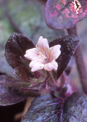 葉は対生し、卵状披針形で長さ6〜10cm、幅4〜7cm。長さ2〜4cmの葉柄があり、表面は銀灰緑色で剛毛を密生し、裏面は赤紫色で、脈上に褐色の縮毛がある。