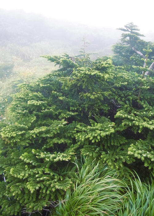 上の写真のように綺麗な円錐形なり、多雪地では枝が大きく垂れ下がっていることが多いが、森林限界付近では低木状になるこようだ。