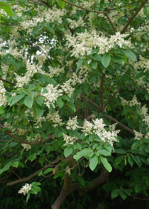霧島山麓の神社の境内を歩いていると、屋根の向こうに白い花を一杯咲かせた樹の花目に入った。