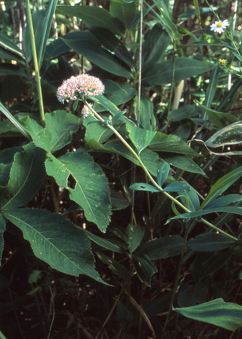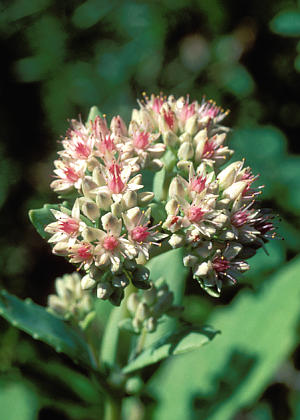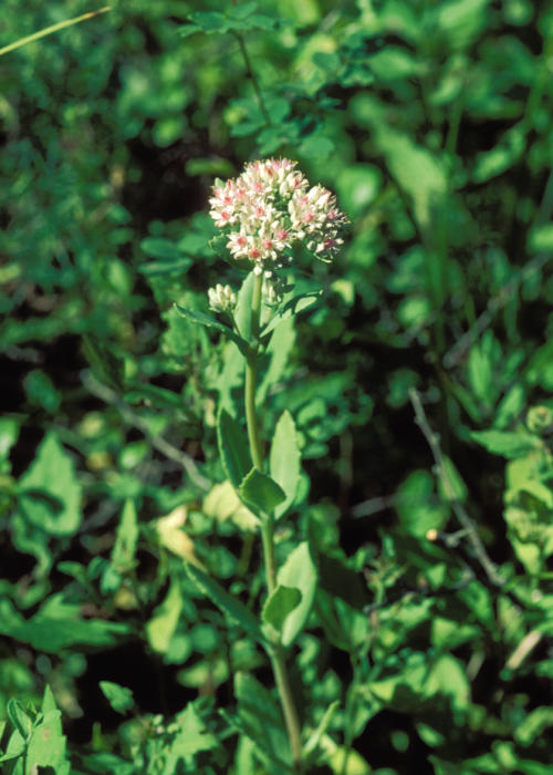 花序は茎頂に散房状につき、半球形。花弁は淡紅色〜紅色、楕円状披針形で鈍頭、長さ5〜6mm。雄しべは2輪で普通10個。裂開前の葯は濃赤紫色。蜜腺は広線形、長さ約0.8mm。雌しべは直立し、長さ約5mm。子房の基部は漸尖形。花柱は長さ約1mm、子房より短い。