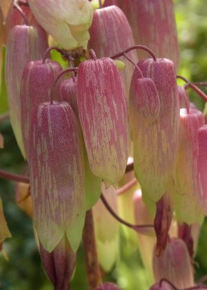 花は円錐状集散花序で時に長さ80cmにもなり、下垂して多数咲く。萼は円筒状で紅色を帯びた黄色、筒部は長さ2.5〜4.5cm。花冠は下半分が淡緑色、上半分は紅色。花筒は長さ2〜4cm、8個の襞があり、裂片は卵状披針形で鋭尖頭、長さ1〜1.5cm、花時には反曲する。