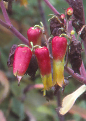 花は花茎の先に多数下垂する。花冠は円筒形で萼は2.5〜4.5cm、紅色。花冠は下半分が淡緑色〜黄色、上半分は紅色。