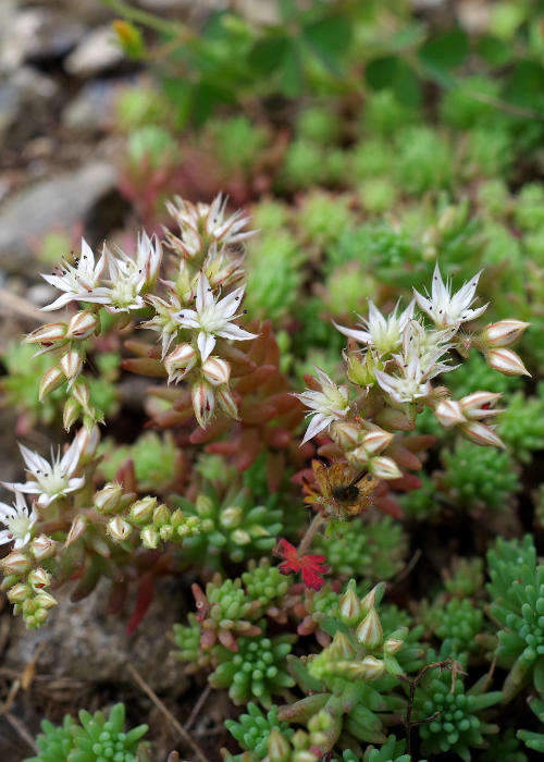花は茎頂に集散花序となり、やや密な多数の花をつける。花柄には疎らに乳頭状毛がある。花弁は5(稀に6)個で離生し、披針形〜披針状卵形で鋭尖頭〜鋭頭、長さ4〜6mm、花時には平開し、白色で、外面の中肋と先端は紅色を帯びる。雄しべは10(〜12)個、2輪に配列し、花弁より短く、長さ2.8〜3.2mm。葯は赤紫色であるが、裂開直前に退色する。蜜腺は倒卵形、長さ約0.7mm、半透明の白色。雌しべは花時で長さ約3mm。子房はほぼ離生し、長さ約2mmで直立する。花柱は長さ約1mm。萼は5(稀に6)個、広三角形〜三角形で鋭頭、長さ約1.5mm、基部でわずかに合生し、白緑色で毛がある。
