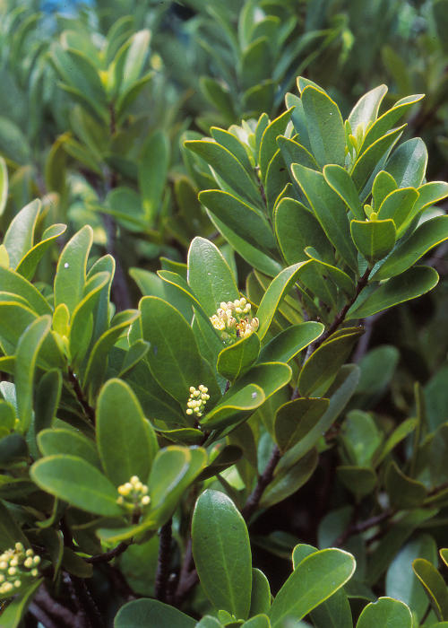 葉は対生、葉身は長楕円形〜線状長楕円形、長さ3〜7cm、幅2〜3cm。先は鈍頭で全縁。質はやや厚く。黄みを帯びた緑色で、裏面は粉白色を帯びる。幼葉も粉白色を帯びる。葉柄は短い。