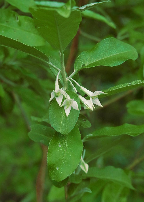 花は葉腋に1〜6個束生し、初め白色で後に黄色を帯びる。萼筒は4稜のある細い筒形で時に湾曲し、基部に向かって次第に細まり、子房の上部で少し括れ、長さ5〜7mm。先は4裂し、裂片は卵形〜三角形、さらに狭長なものもあり、鋭尖頭〜鋭頭。花柄は長さ3〜5mm。萼筒、萼片、子房、花柄には銀色の鱗状毛が密生する。