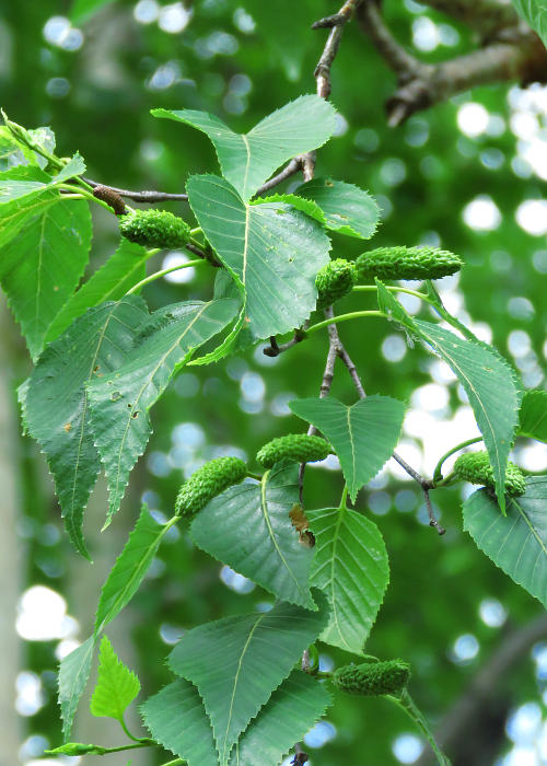 葉は長枝では互生、短枝で1対つく。葉身は三角状広卵形〜三角状卵形、長さ5〜10cm、幅3〜7cm。先は鋭尖頭、基部は円形〜やや切形〜やや浅心形、縁には鈍凸端に終わる不揃いの重鋸歯がある。側脈は7〜12(〜15)対あり、裏面に隆起する。光沢があり無毛で、裏面は淡緑色で、時に脈上に少し伏毛が残り、脈腋には毛叢がある。葉柄は長さ1〜3.5cm。