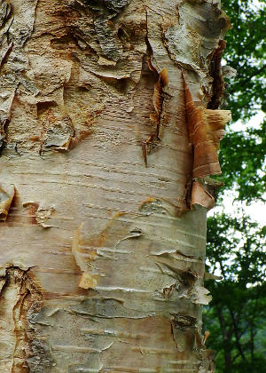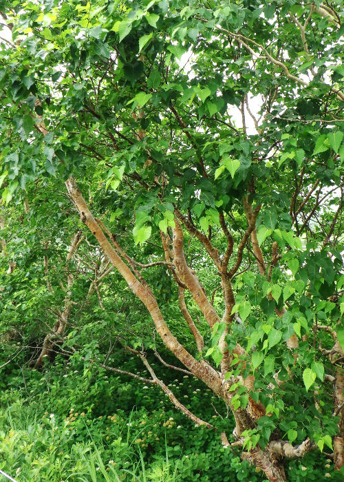 高原の風景でよく見かけるシラカバによく似てより高い場所に生え、違いは樹皮が赤みを帯びることで、白色になるシラカバとの違いである。