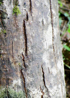 幹は直立し、径25〜30(-70)cm、樹皮は緑色〜暗緑色で黒い縦縞がある。