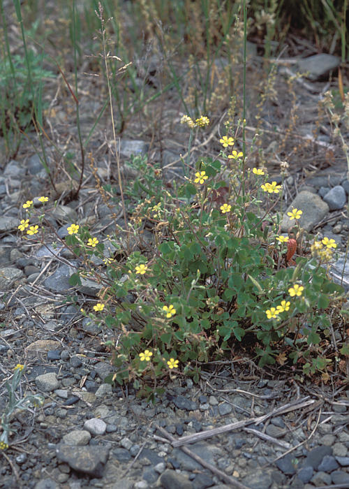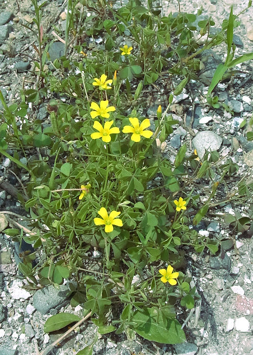 カタバミによく似た黄色の花を咲かせるが、茎が立ち上がることや、白い毛が多いこと、托葉がごく小さいことで区別される。