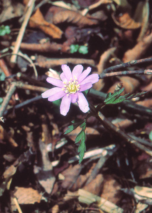 母種のキクザキイチゲに比べ葉や花が小型であるのが特徴で、