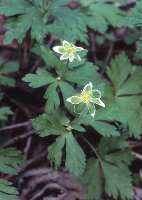 ニリンソウの萼片が緑化したもので、緑化の度合いは変化が多い。その他の形態はニリンソウと変わらず。