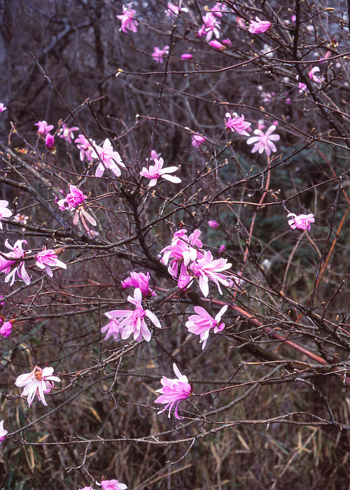 若葉が芽を出したばかりの春浅い丘陵地、少し湿地っぽい林の中に淡紅色を帯びたコブシにた花をつけた木が点在していた。