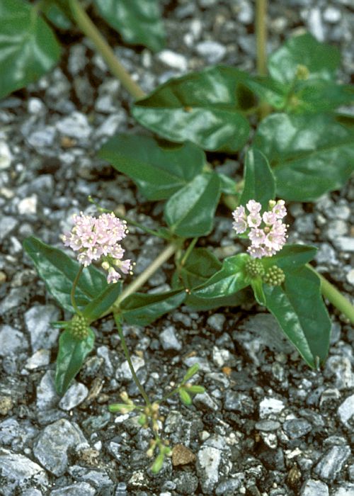 道路上に茎を伸ばし、葉に付け根から出た細い花茎の先に淡紅色の花が固まって咲いていた。