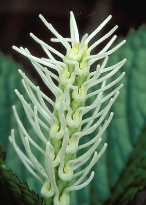 花は茎頂に1本穂状花序を伸ばし、多数の花を密集してつける。花序は長さ約2cm、果期には約3cm。苞は横幅が広く3裂し、長さ約1.5mm、幅2.5〜3mm。花は1個の雌しべと3個の雄しべからなり、雄しべは3個で基部で合着し、うち中央の1個の雄しべが3分岐し、葯隔は糸状に伸び、白色で長さ8〜12mm、中央の雄しべは内側に2個の葯、両側の2個の雄しべの外側にそれぞれ1個の黄色の葯がつく。子房は長さ約1mm。