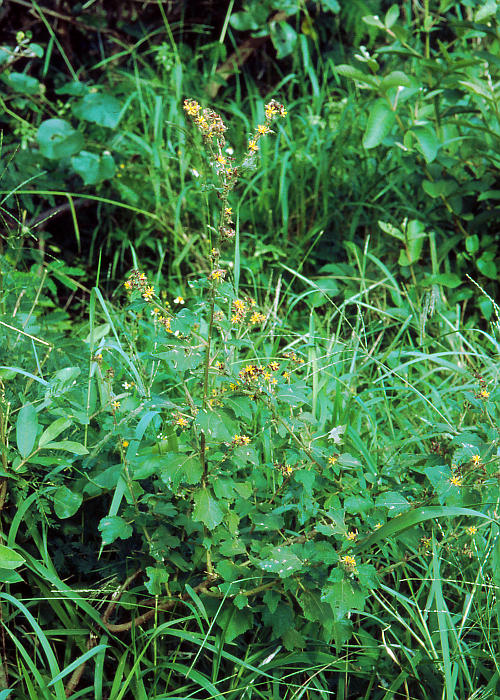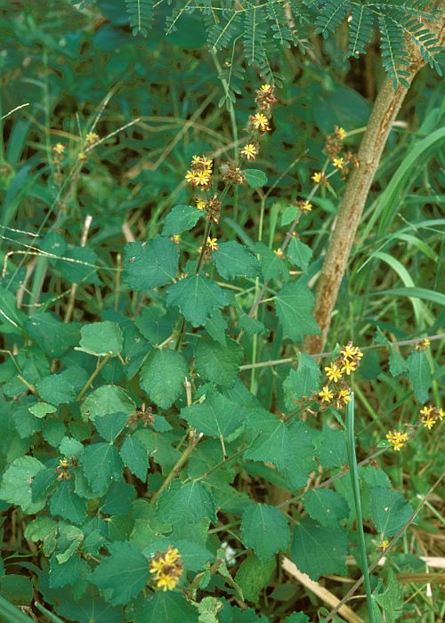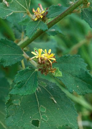 葉は互生、葉身は円形〜菱形状卵形で長さ3〜8cm、幅1〜4cm。葉の形は変化が大きく、先は3〜5浅裂するが、上部の葉はやや小さく裂けない。