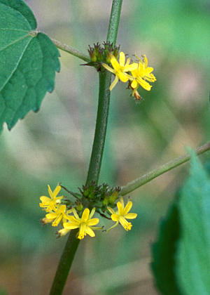 花は葉腋に集散状に数個つく。花は黄色で直径約5mm、花弁は5個、倒卵状長楕円形で、萼片より短い。雄しべは10個。萼片は5個、長披針形で先端に突起がある。