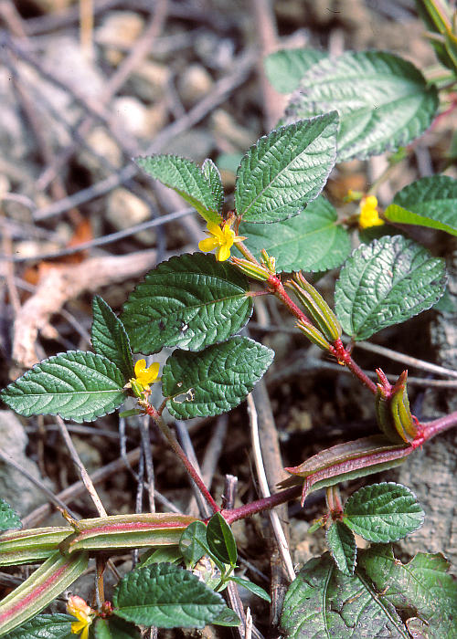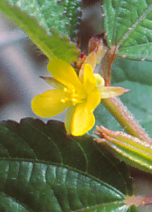 花は葉に対生して1〜2個つき、径約8mm。短い花序柄の先のごく短い花柄の先に散状につく。がある花弁は5個、黄色。雄しべは多数。