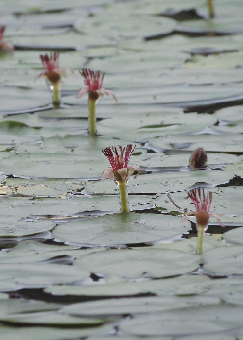 目を凝らすと点々と、水面上に顔をのぞかせている暗紫色の花が目に入ってきた。